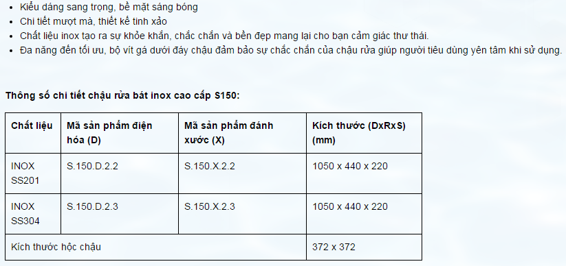 Sản xuất bằng vật liệu siêu bền inox SUS 304 có độ chống ăn mòn cao, chống ngưng tụ nước dưới đáy chậu. Sử dụng công nghệ ép liền không hàn mài, xử lý bề mặt trên dây truyền tiên tiến hiện đại nhất hiện nay. Sản phẩm thân thiện với môi trường, giúp bảo vệ sức khoẻ cho cả gia đình. Liên hệ Hotline 0919566488 nhận ngay ưu đãi
